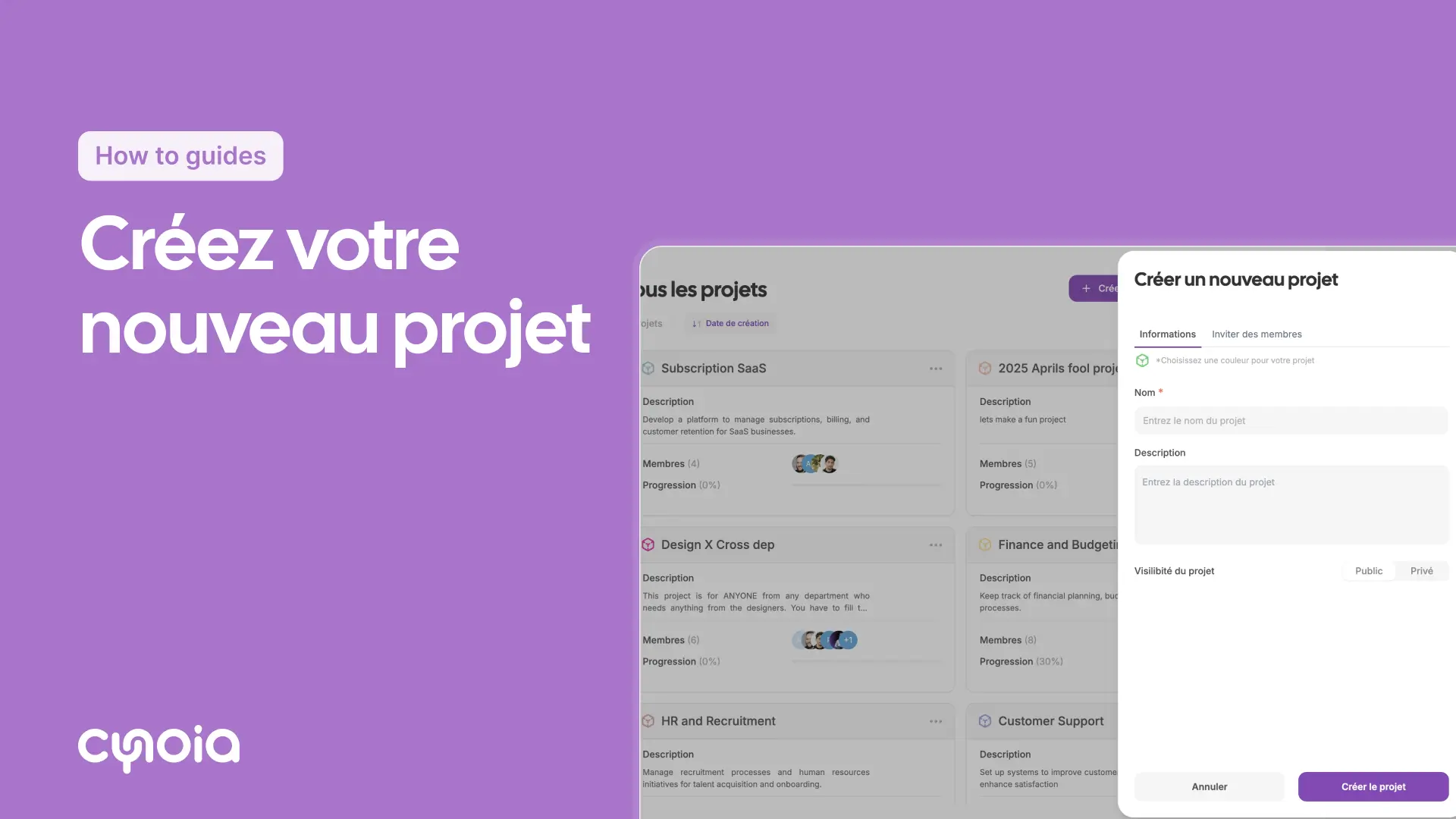La création d’un nouveau projet sur Cynoia permet d’organiser des tâches, de collaborer avec les membres et de gérer les flux de travail efficacement.