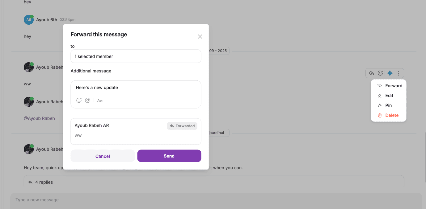 Forward messages → send a message to another user or channel, with the option to add context.
