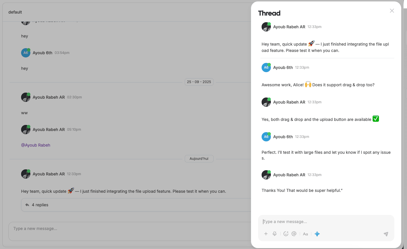 Threaded replies in chat → keep conversations organized without flooding the channel.