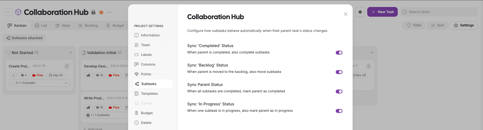 Subtask behavior rules → configure how subtasks respond when their parent task’s status changes.
