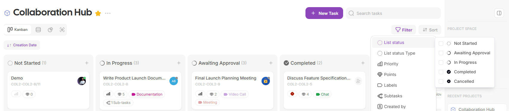 Task Filtering: Filter project tasks by list status or list status type for easier management.