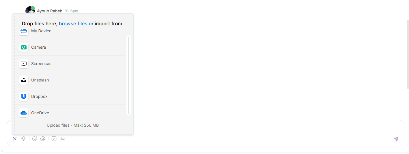 New Attachment Options: Upload attachments in chat and tasks from multiple sources: Camera record, screencast, Unsplash, Dropbox, and OneDrive.