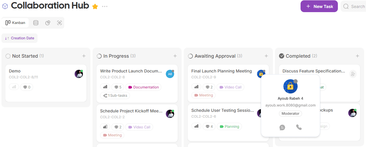 User Card on Hover: Quickly access options like sending a direct message or starting a direct call by hovering over a user’s badge.