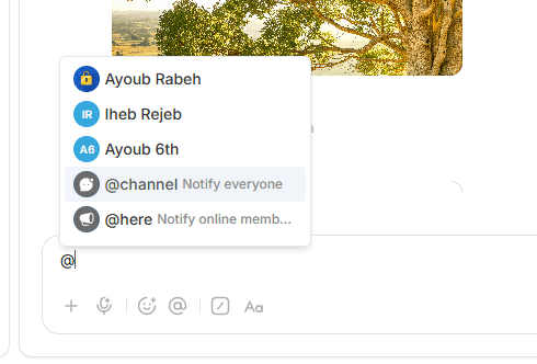 @channelto notify all channel members or@hereto notify only connected users.