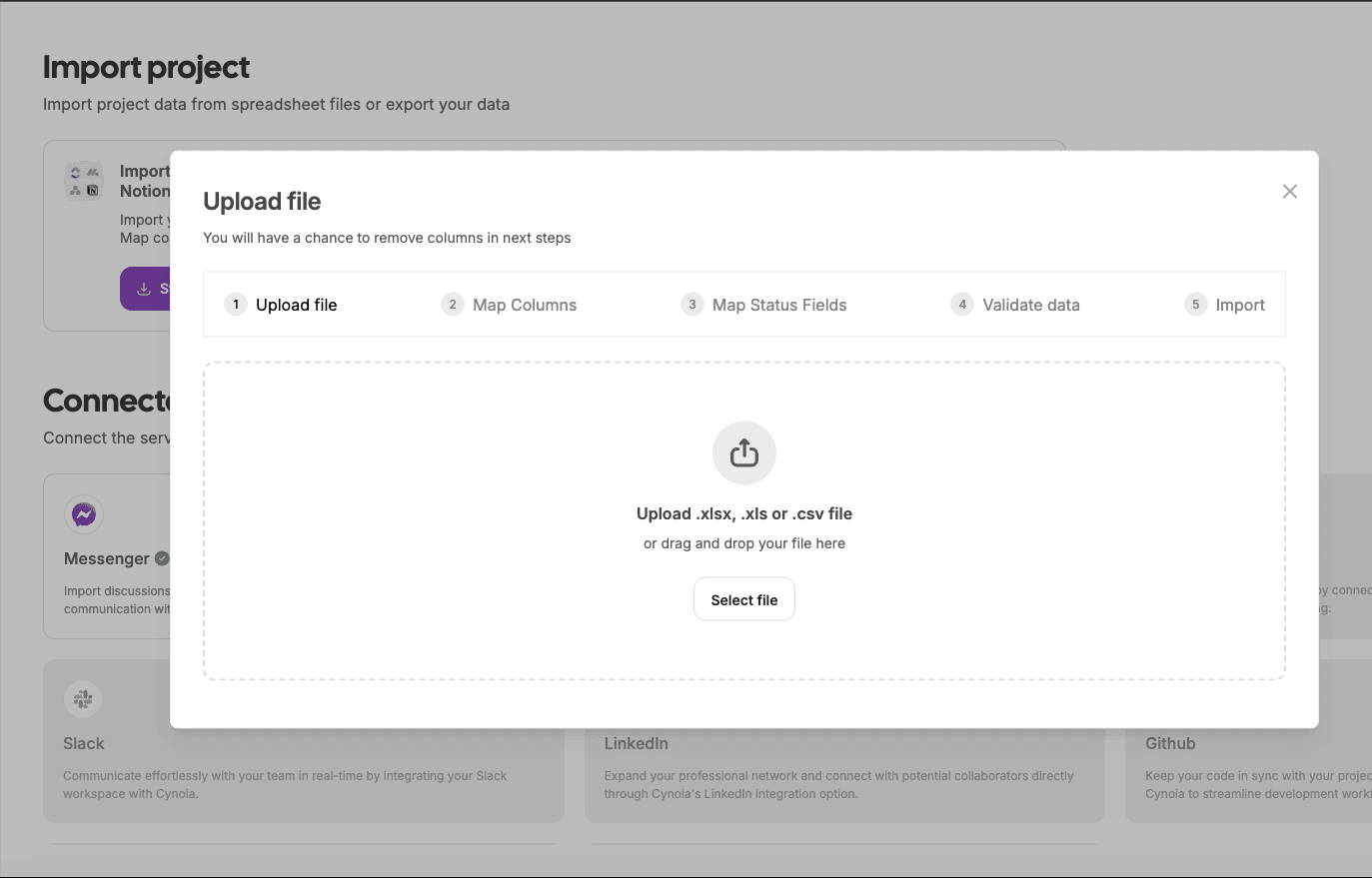 Project Import Wizard: Import projects from any tool exporting to CSV or Excel (.csv, .xlsx, .xls). Map columns, validate data, and track progress in a single, guided flow.