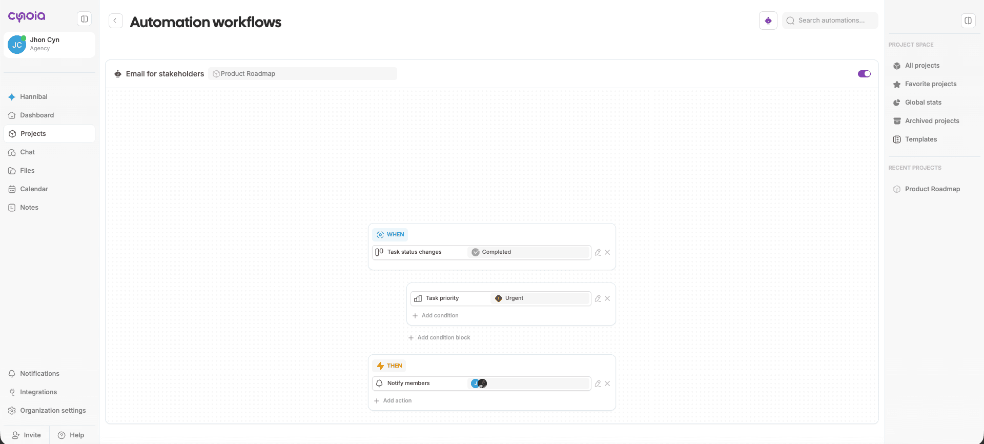 Whenever an urgent task is completed, Cynoia automatically sends a notification to the selected team members.