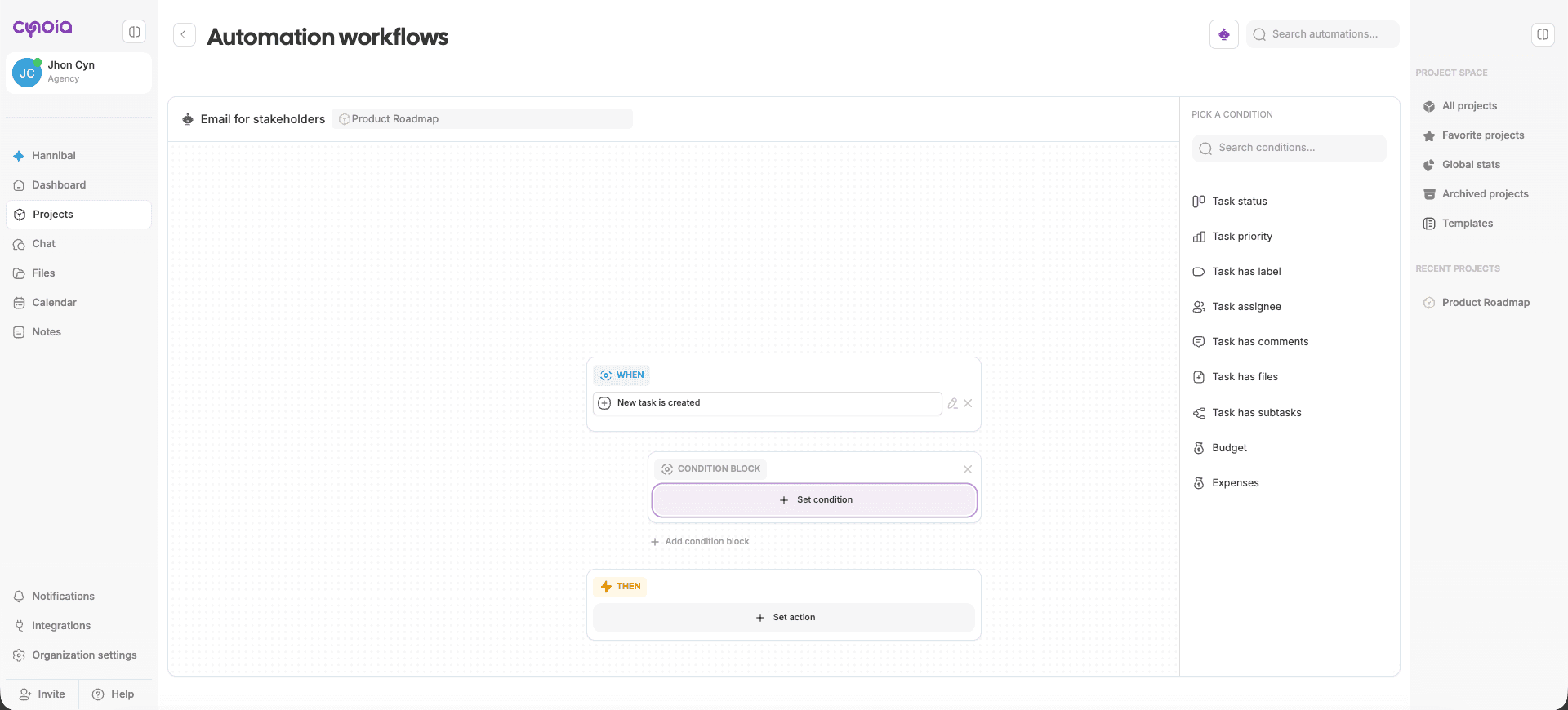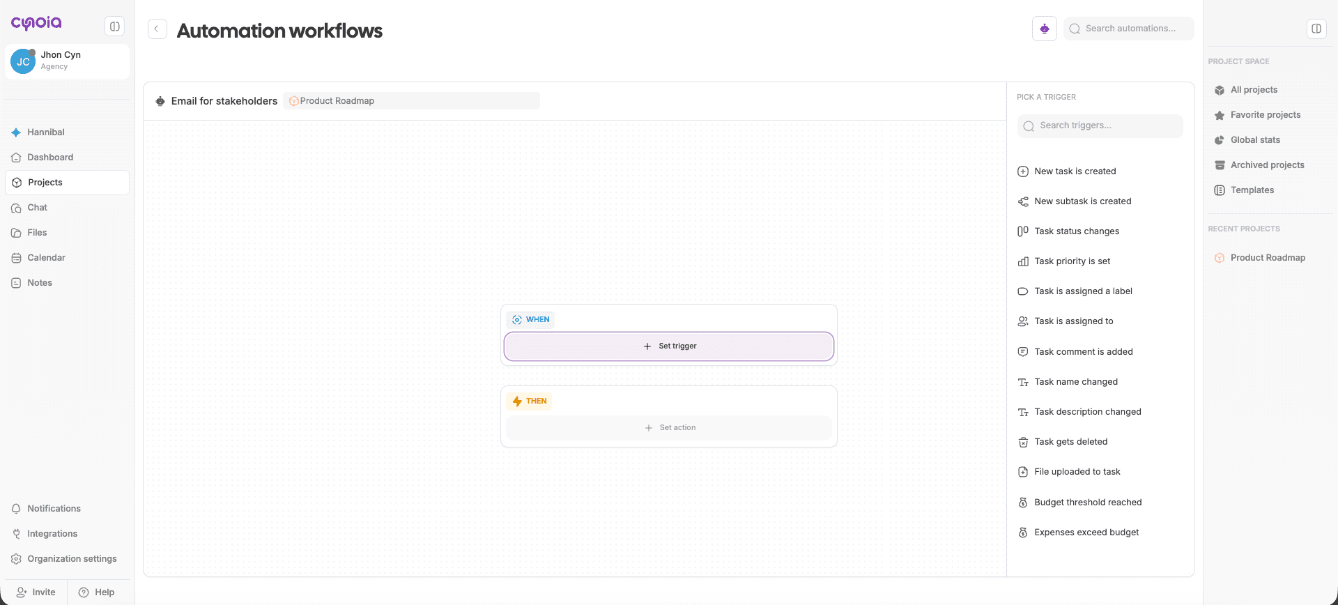 Automations in Cynoia help you reduce manual work, enforce consistency, and keep your team informed by automatically reacting to task events.