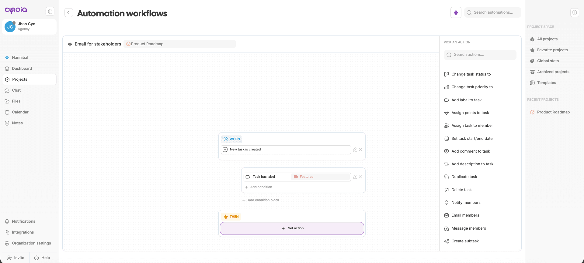 Actions define what Cynoia should do automatically when the trigger and conditions match.