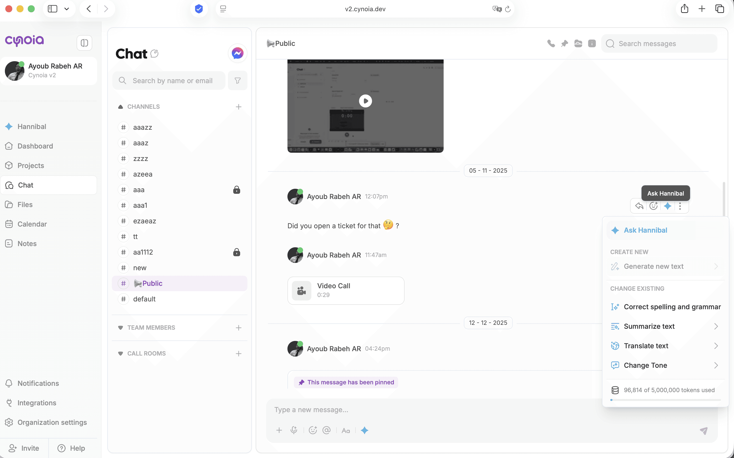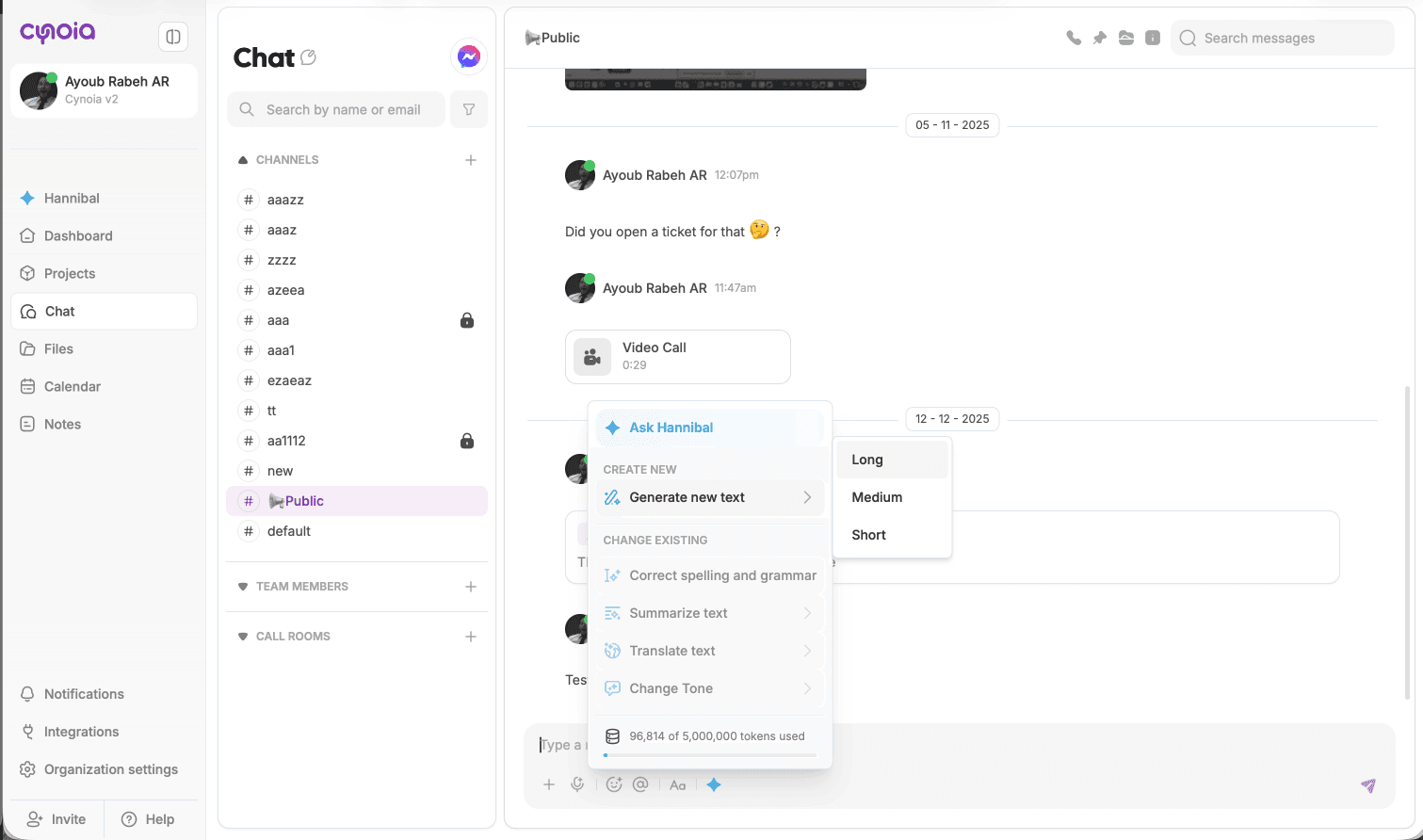 Hannibal helps you communicate faster and more clearly inside Cynoia Chat.