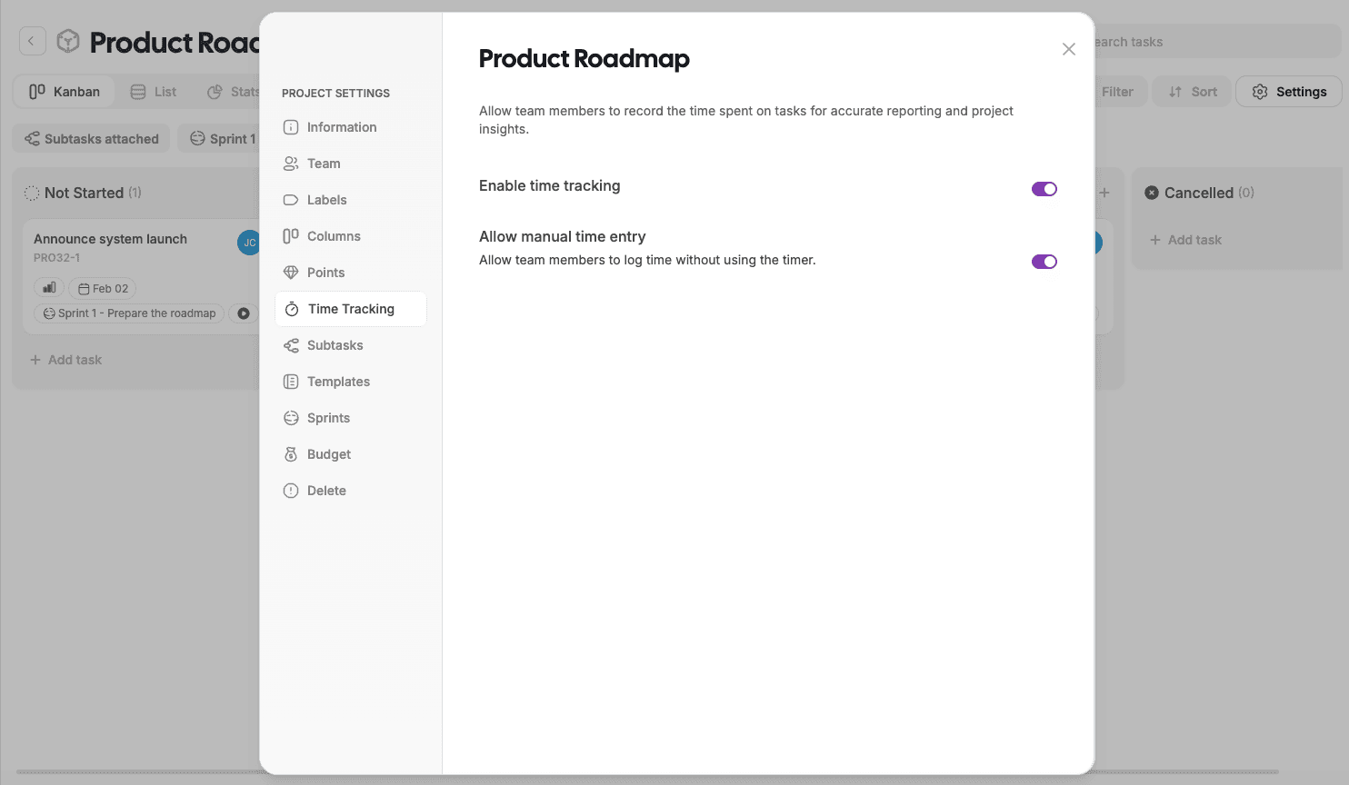 Allow team members to record the time spent on tasks for accurate reporting and project insights.