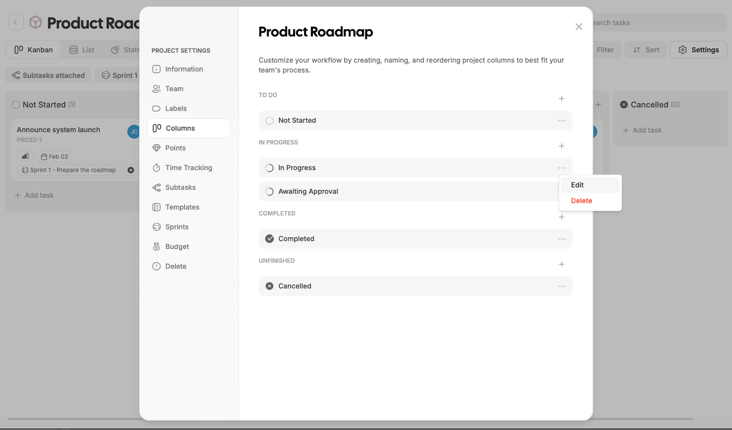 Columns define the workflow statuses for tasks.