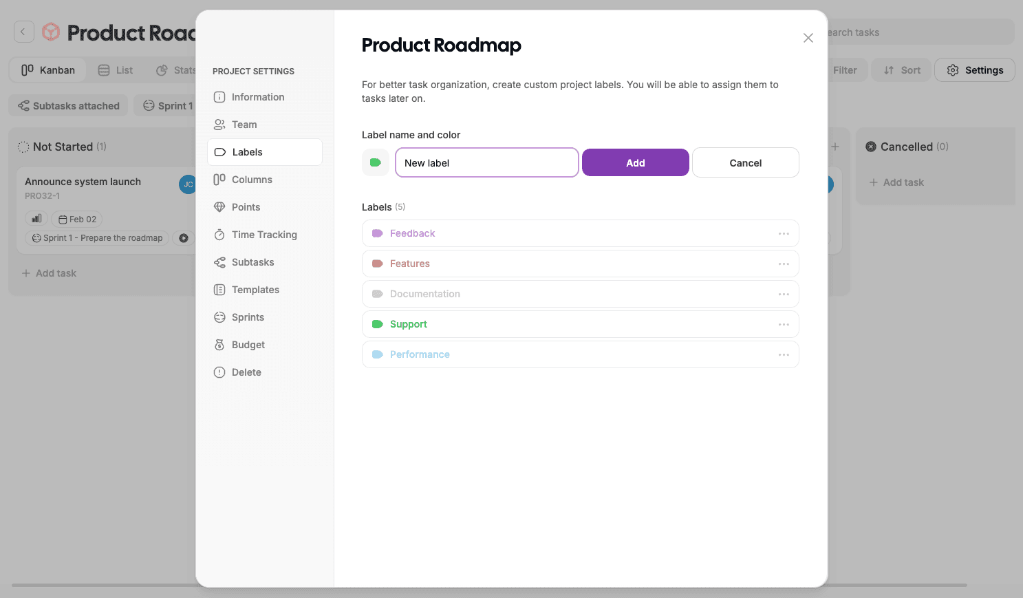 Labels help categorize and organize tasks inside a project.